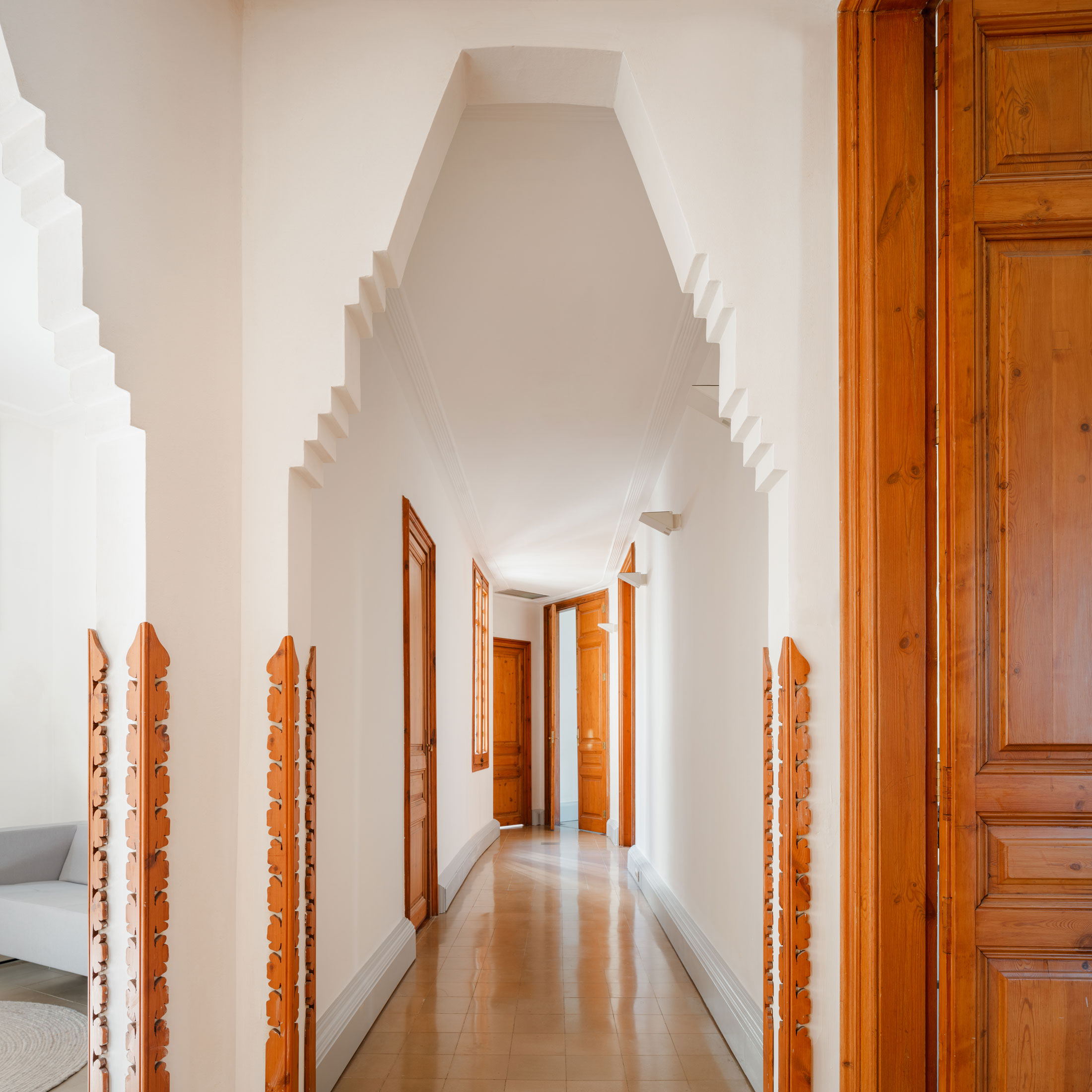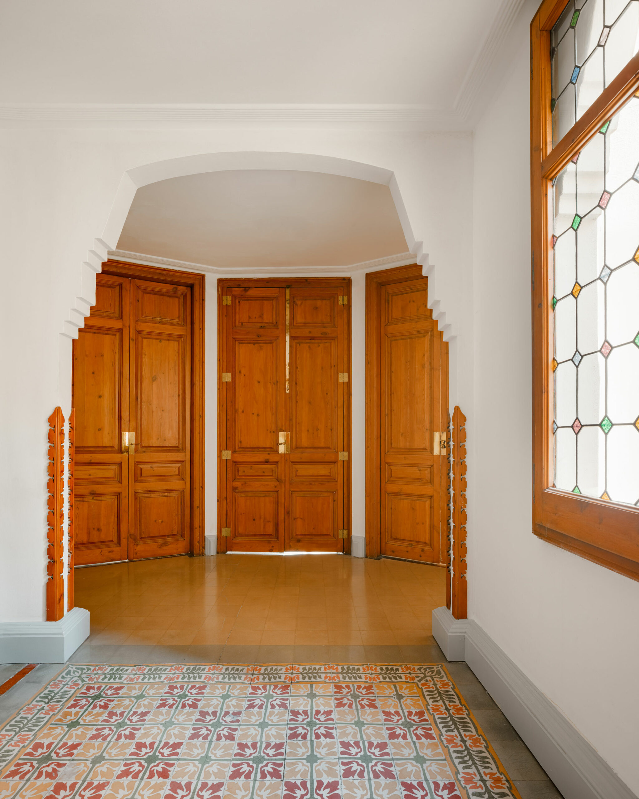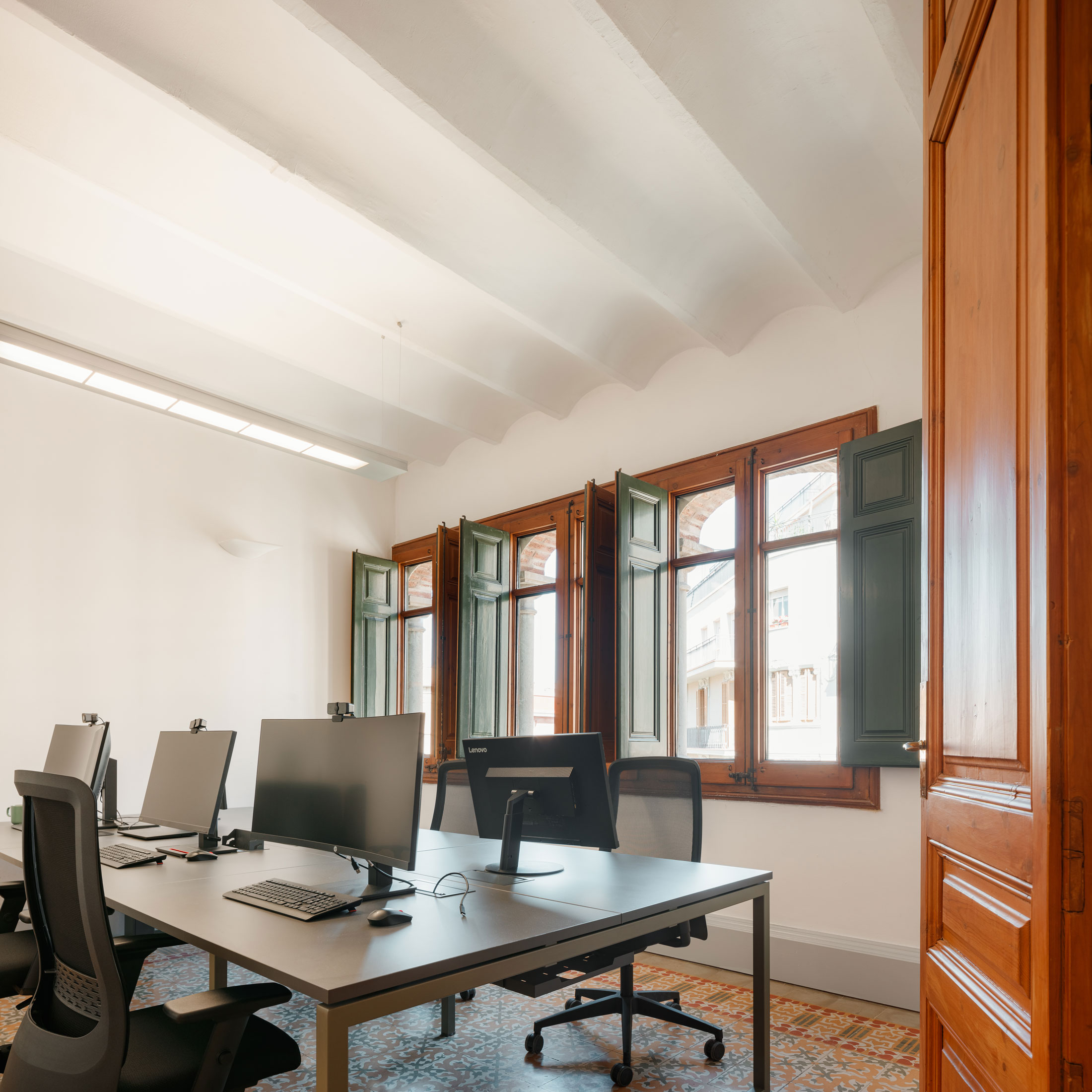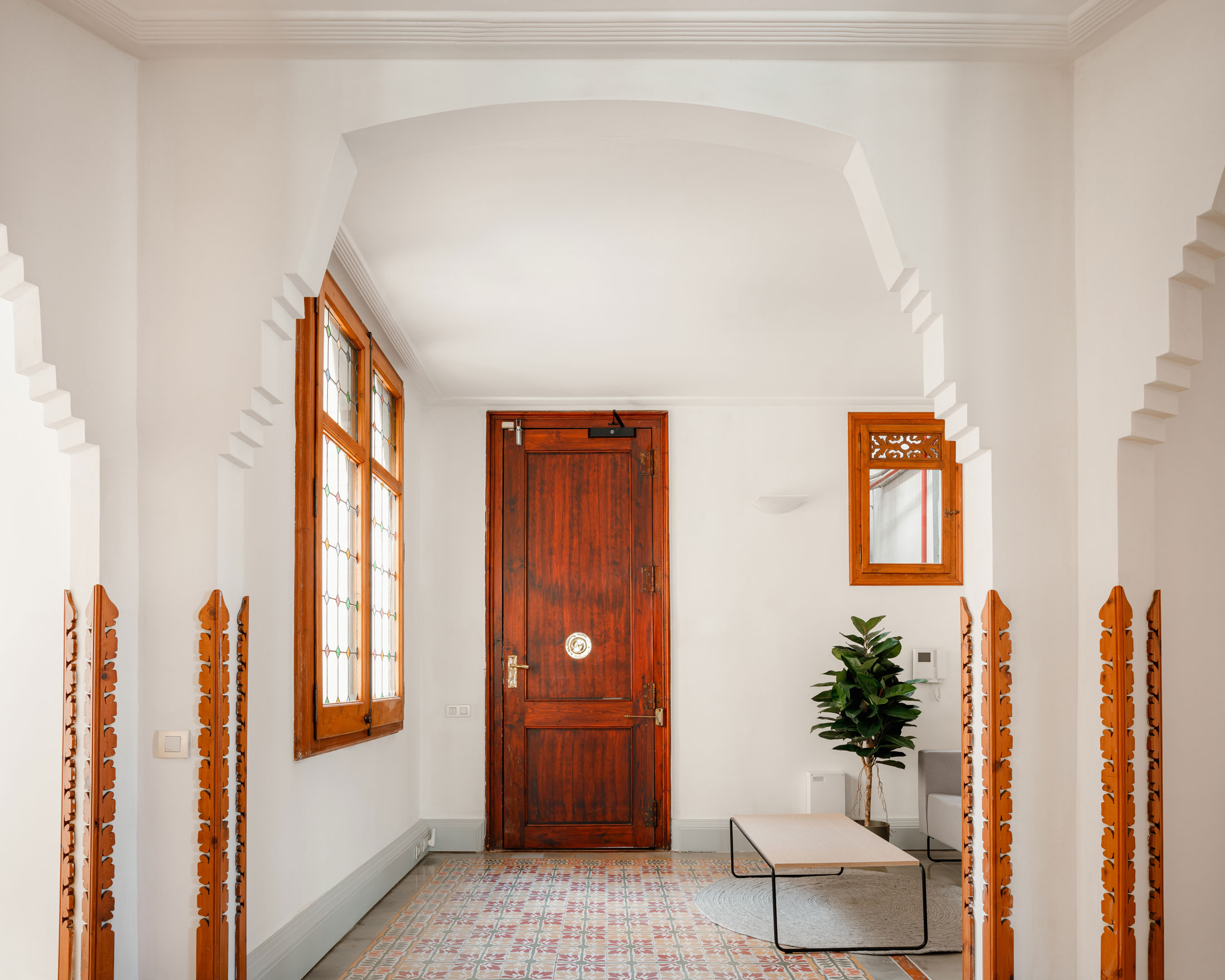 La selección del mobiliario se inspiró en los tonos del mosaico hidráulico que aporta tanta personalidad al espacio. Verdes, rojizos y anaranjados se funden armoniosamente, creando un ambiente cálido y envolvente. La madera original de la decoración resalta en los pasillos e espacios comunes, dialogando con los diferentes mosaicos hidráulicos presentes en el edificio. Las plantas completan la decoración, aportando naturalidad sin restar protagonismo a los elementos originales, que siguen siendo los grandes protagonistas del espacio.