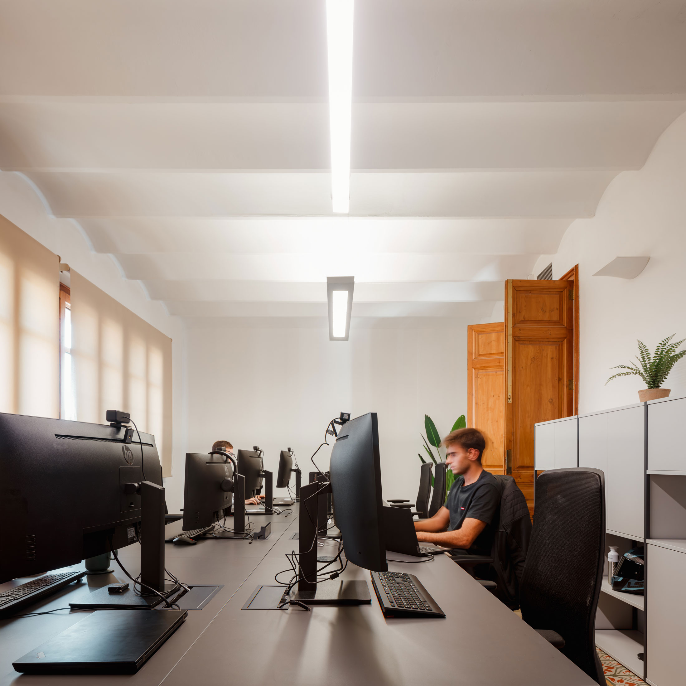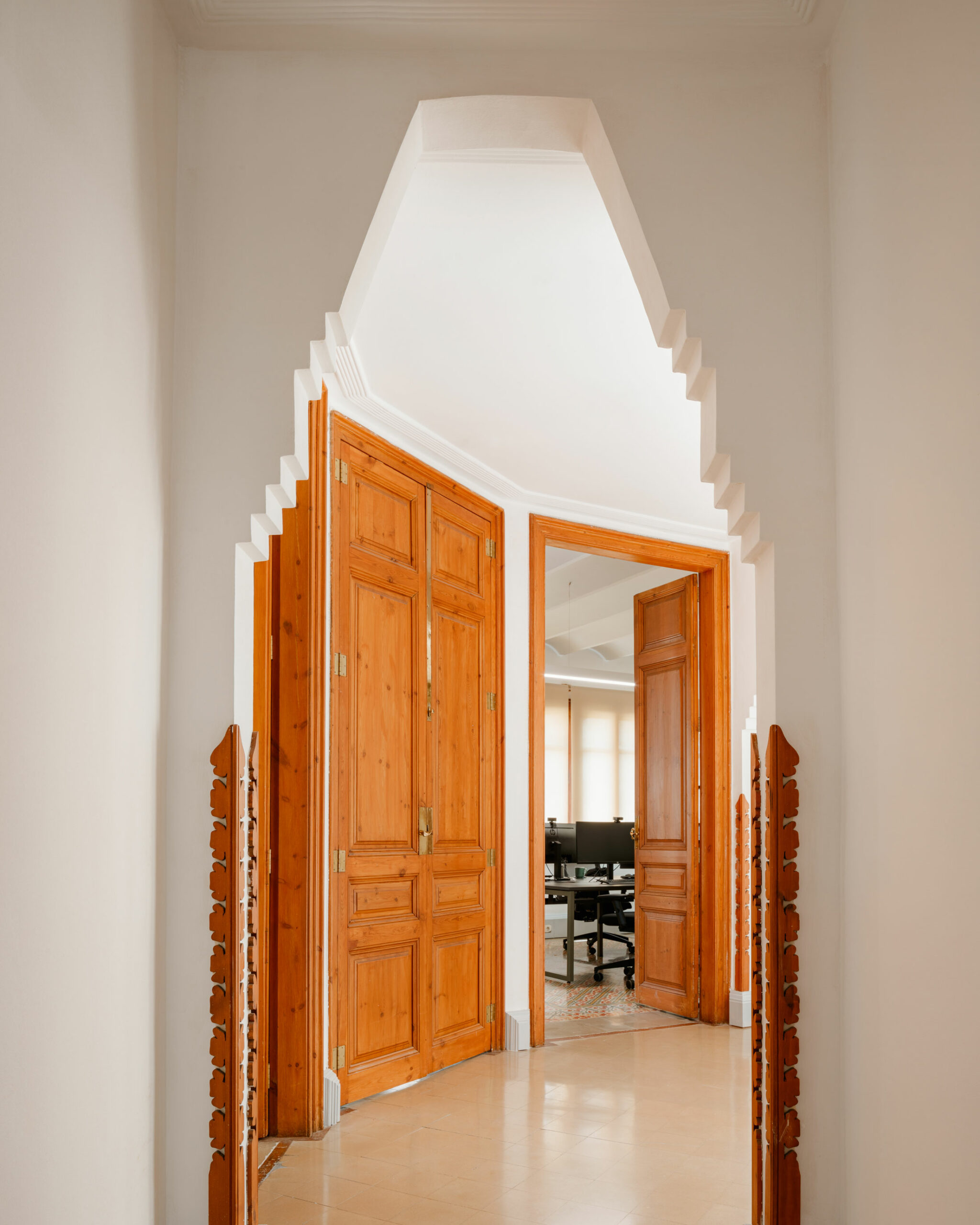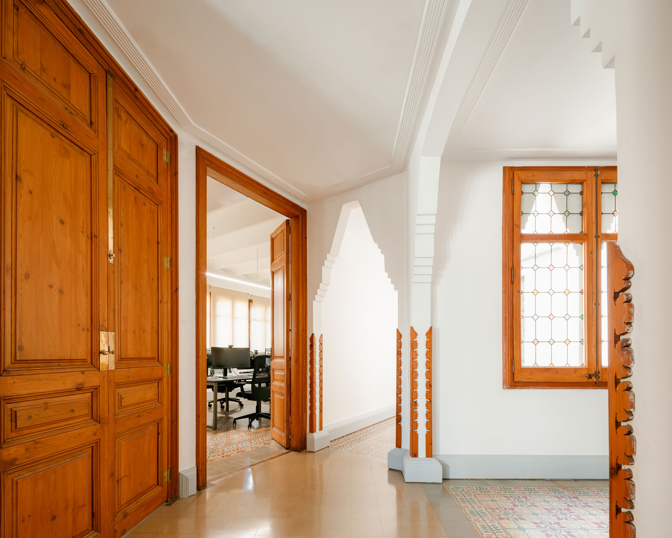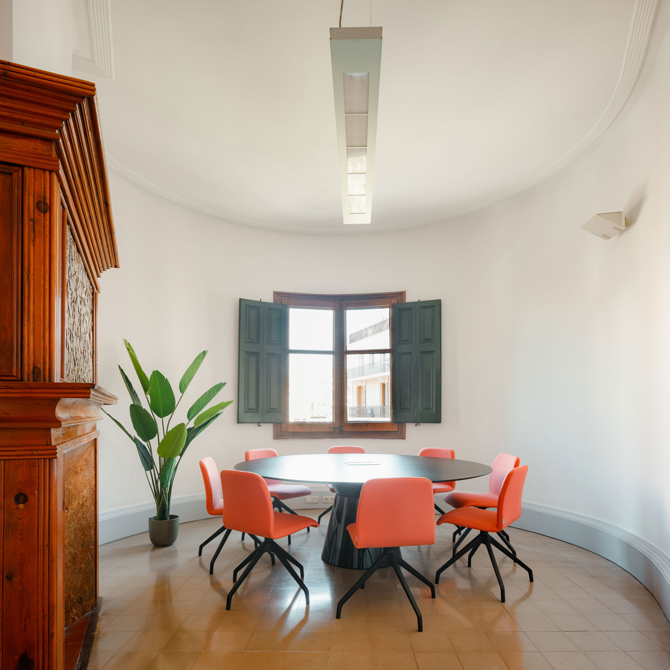 La casa de les Punxes, situada en uno de los chaflanes más emblemáticos de la Avenida Diagonal, la Casa de les Punxes, obra del arquitecto Josep Puig i Cadafalch, es uno de los ejemplos más destacados del modernismo barcelonés del siglo XX. Para nuestro estudio, el principal reto fue respetar al máximo todos sus elementos originales, trabajando únicamente con mobiliario y algún otro elemento que cumpliera con los requisitos funcionales sin alterar la esencia del espacio. Otro reto consistió en adaptar el programa de la oficina a las formas circulares y triangulares de los espacios en planta.